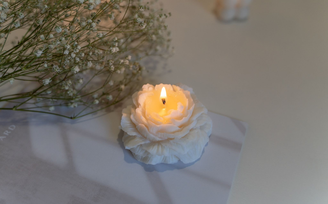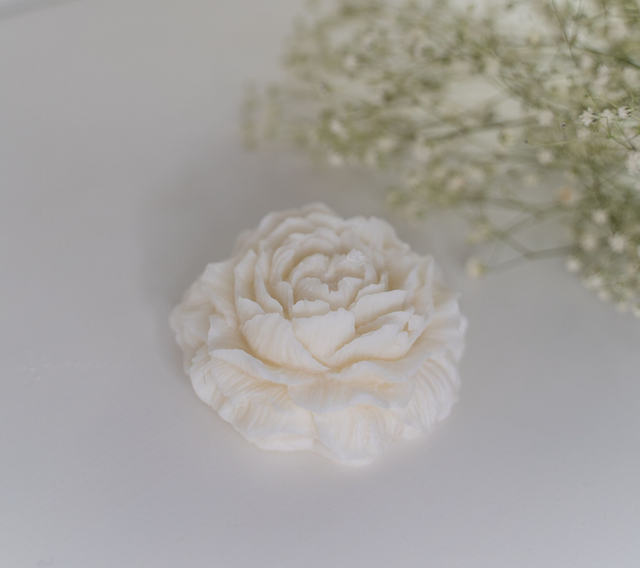Notre bougie Eirene, en forme de pivoine est faite à partir de cire de soja.